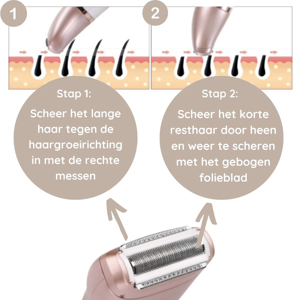 Met de ronde kop kun je gemakkelijk het haar van het gezicht verwijderen en de V-vormige kop is geschikt voor de ontharing van het lichaam.