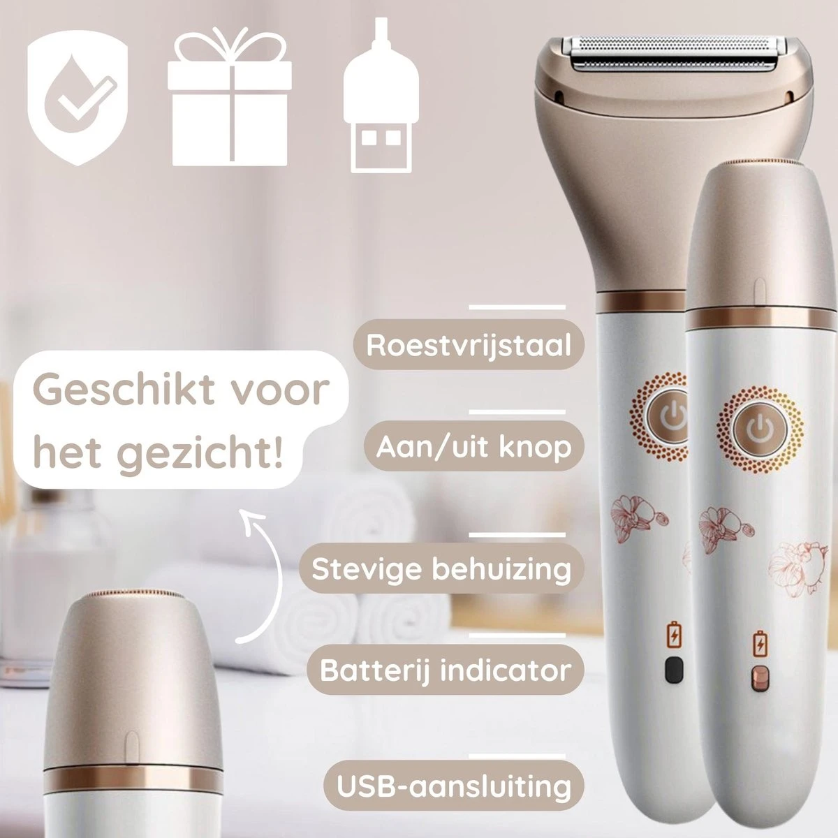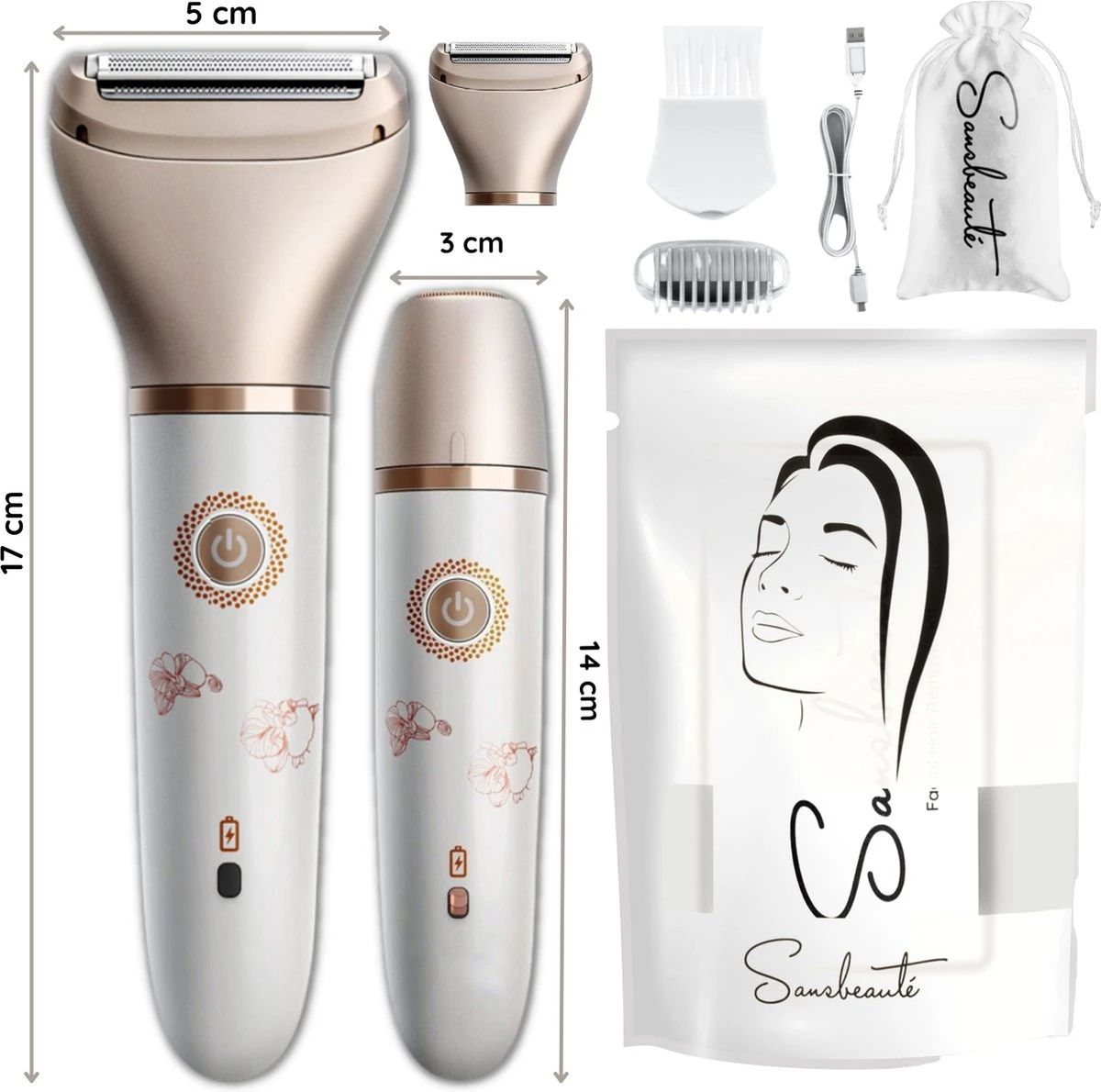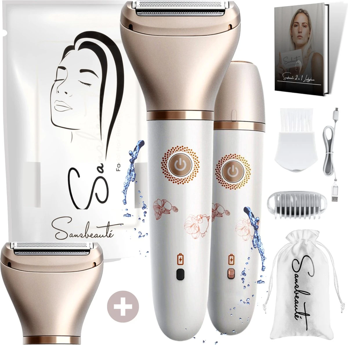 Klaar met ongewenst haar op je gezicht (bovenlip, kin, wangen, kaaklijn) en lichaam (benen, armen, handen, oksels, bikinilijn / bikinitrimmer)? En je bent die pijnlijke scheerapparaten zat? De Sansbeauté® 2-in-1 Ladyshave Edition is dé perfecte oplossing! Met 2 verschillende scheerkoppen scheer jij elk haartje op je gezicht en je lichaam pijnloos weg! Daarnaast heb je met de 2 opzetstukken in één klap alles in huis, dus ook financieel aantrekkelijk! Door de verwerking van LED-icoontjes kun je nu gemakkelijk aflezen wanneer je moet reinigen en opladen. Ook is het draadloze apparaat volledig waterproof waardoor een fijne behandeling onder de douche of een snelle reiniging onder de kraan een feit is! Al met al, een perfecte set voor jou en ONMISBAAR in noodsituaties! Ook wordt deze set geleverd met een EXTRA scheerkop, dat betekent een koop voor de lange termijn! Als kers op de taart ontvang je een exclusief e-book met waardevolle tips, zodat je het product optimaal kunt benutten en de beste resultaten kunt behalen!