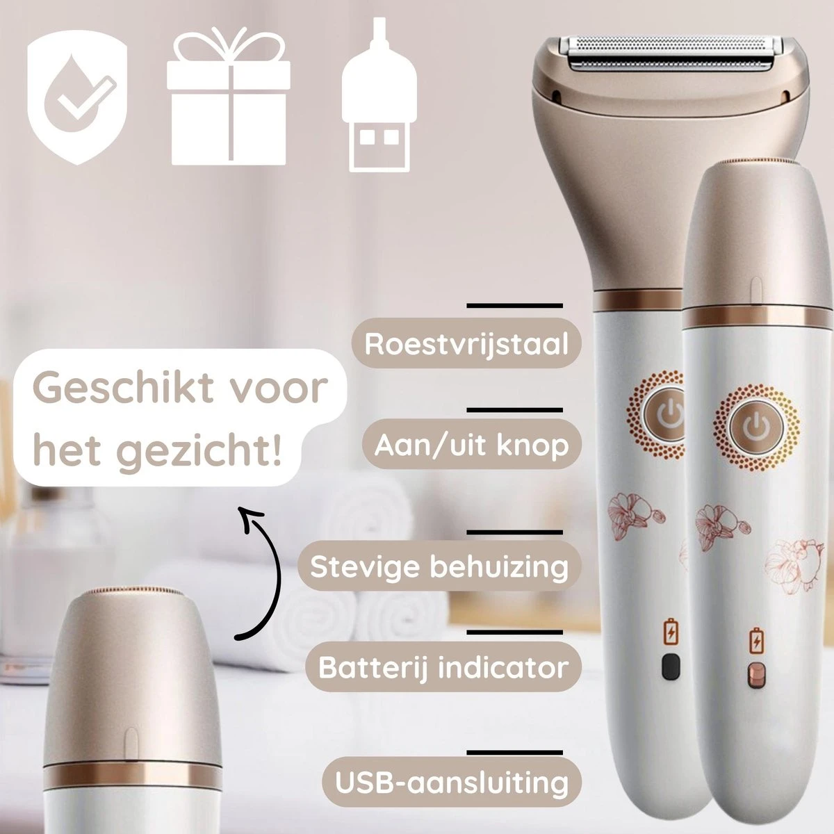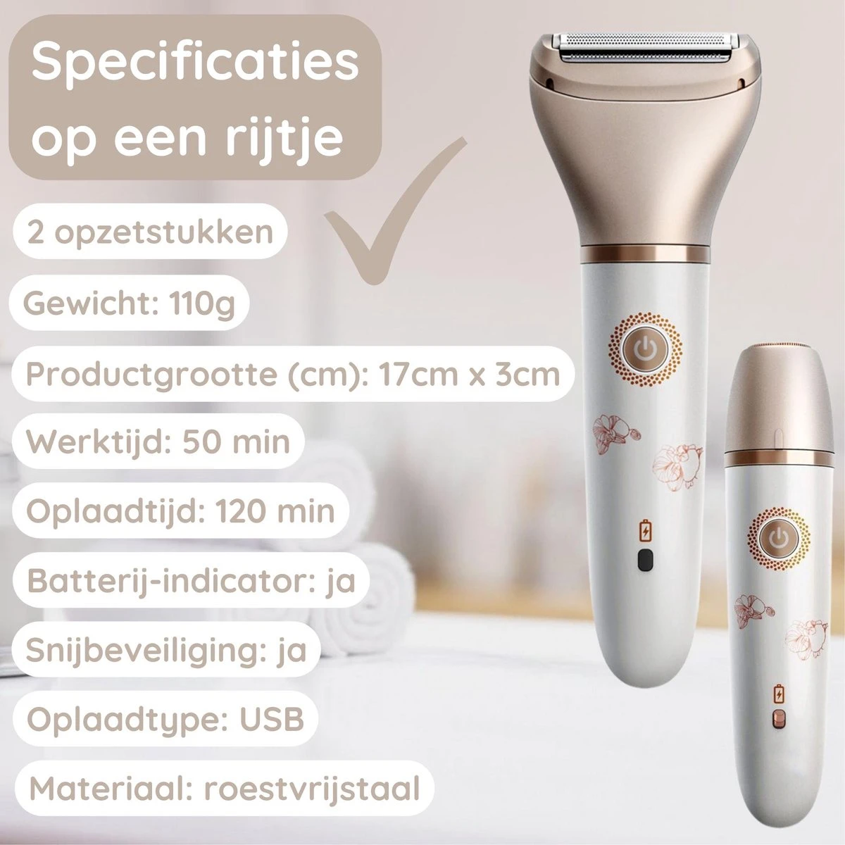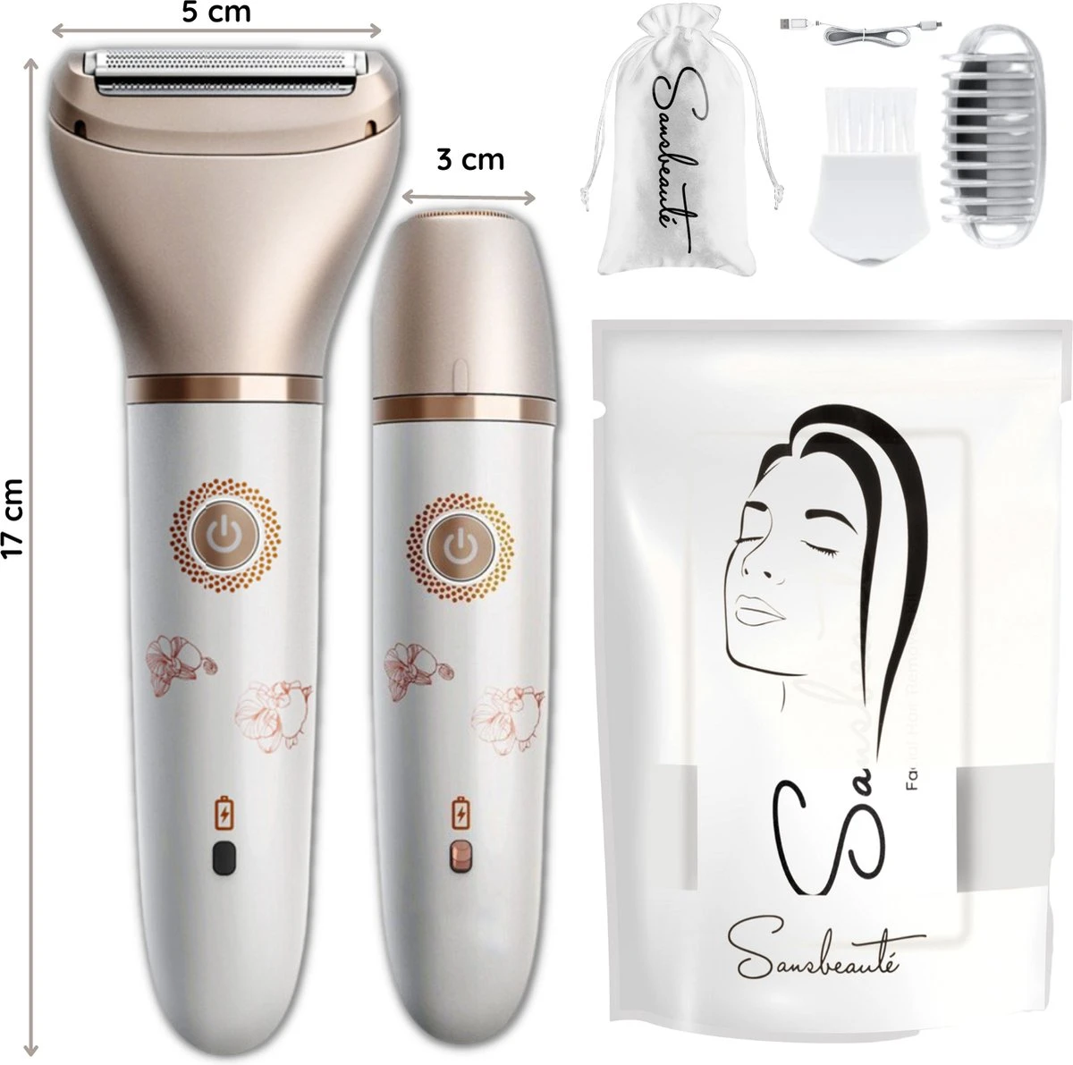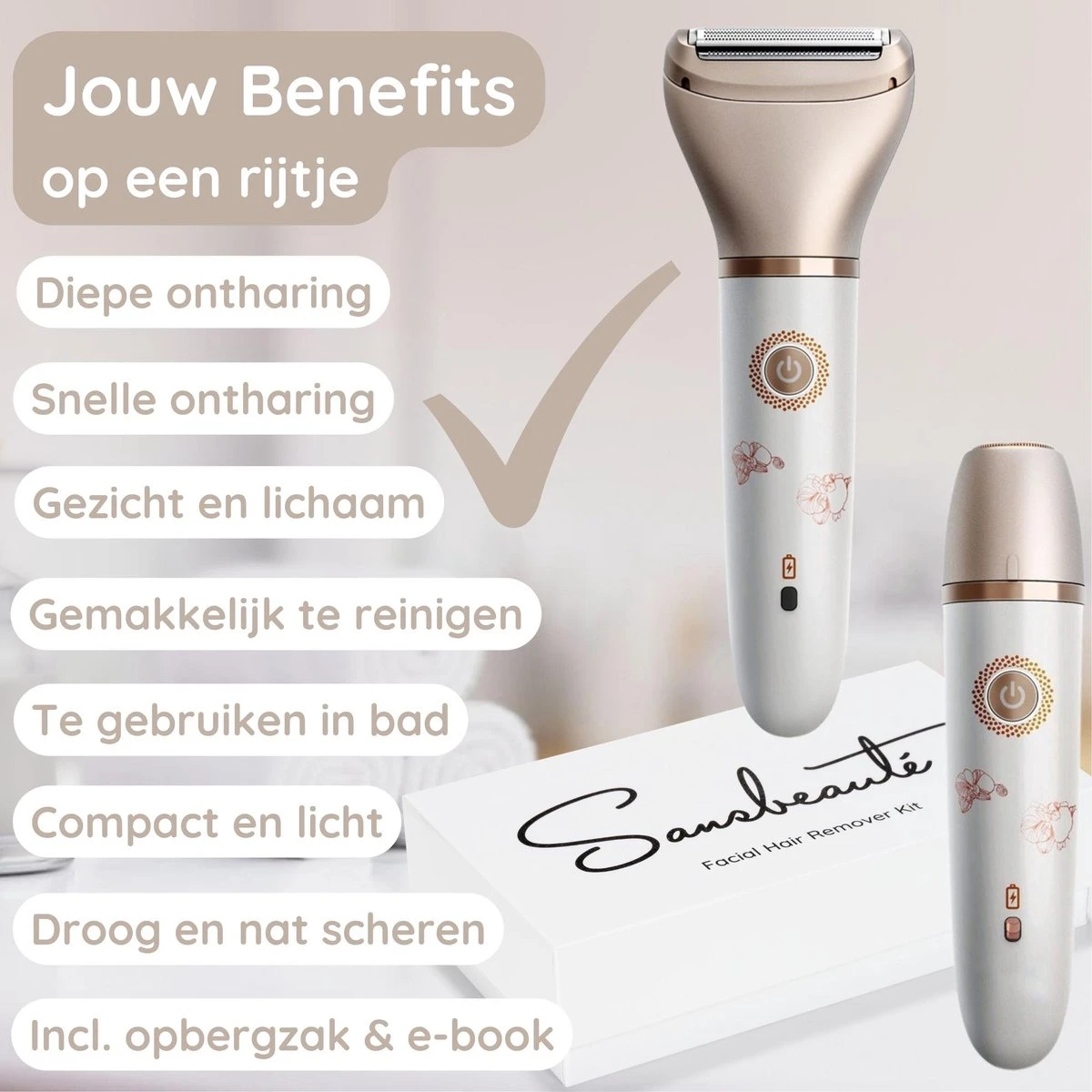 Klaar met ongewenst haar op je gezicht (bovenlip, kin, wangen, kaaklijn) en lichaam (benen, armen, handen, oksels, bikinilijn / bikinitrimmer)? En je bent die pijnlijke scheerapparaten zat? De Sansbeauté® 2-in-1 Ladyshave Edition is dé perfecte oplossing! Met 2 verschillende scheerkoppen scheer jij elk haartje op je gezicht en je lichaam pijnloos weg! Daarnaast heb je met de 2 opzetstukken in één klap alles in huis, dus ook financieel aantrekkelijk! Door de verwerking van LED-icoontjes kun je nu gemakkelijk aflezen wanneer je moet reinigen en opladen. Ook is het draadloze apparaat volledig waterproof waardoor een fijne behandeling onder de douche of een snelle reiniging onder de kraan een feit is! Al met al, een perfecte set voor jou en ONMISBAAR in noodsituaties! Als kers op de taart ontvang je een exclusief e-book met waardevolle tips, zodat je het product optimaal kunt benutten en de beste resultaten kunt behalen!