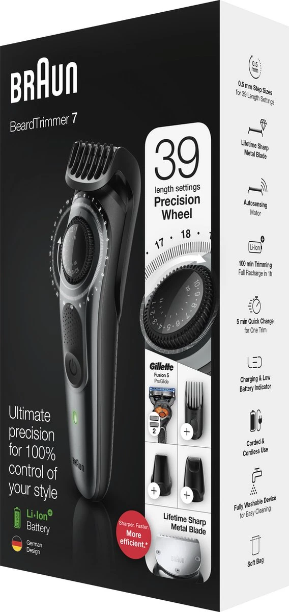 De innovatieve adaptieve motor van Braun analyseert uw baard 13 keer per seconde en past de kracht van de trimmermotor aan op de dikte ervan, waardoor hij elke baardtype moeiteloos afwerkt. De motor biedt extra kracht waar nodig, waardoor Braun trimmers ongekende prestaties leveren ten opzichte van alle vorige generaties Braun trimmers.