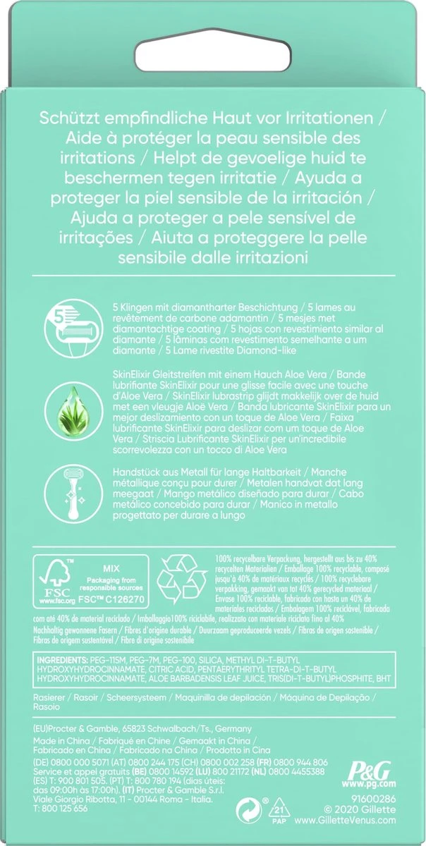 - Langdurige gladheid: Het scheermesje heeft 5 mesjes en een SkinElixir* lubrastrip voor een extra gladde lang aanhoudende scheerbeurt, met tot 0% irritatie** (*voor glijden/**Amerikaanse consumentenstudie feb 2018)