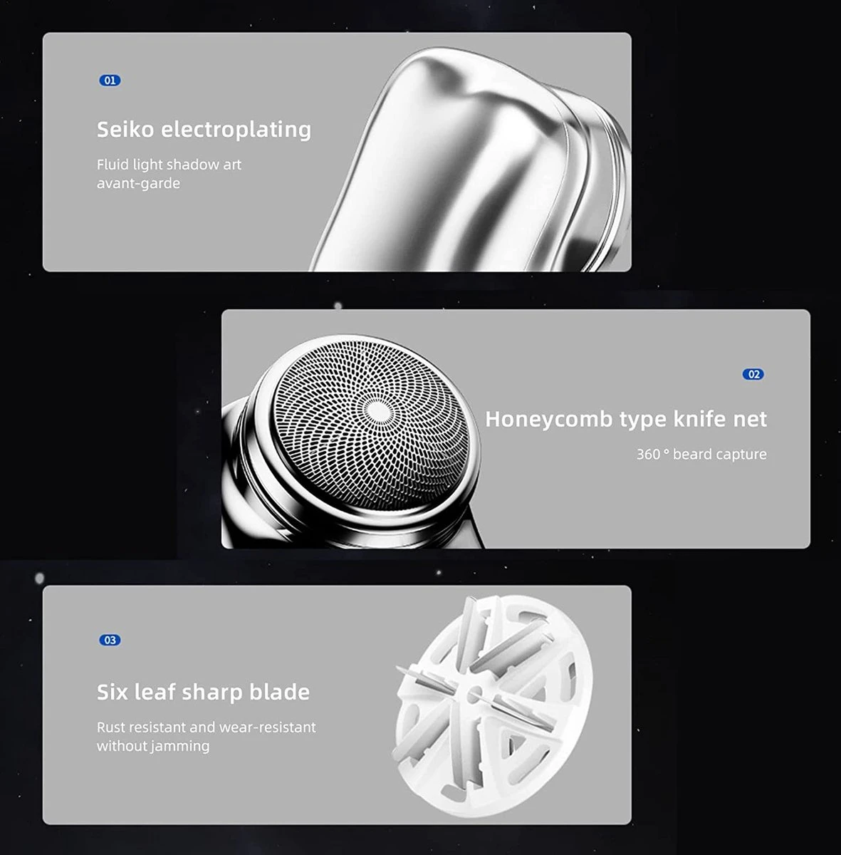 15 messcherp roestvrijstalen turbo wervelstroomblad, gespecialiseerd in harde baard, 0,1 mm dunne roestvrijstalen folie, dubbele ring 3D-mesnet, verhoogt het scheervolume, zwevend boogoppervlak glad en past op de huid, verwijder het haar van de wortel.