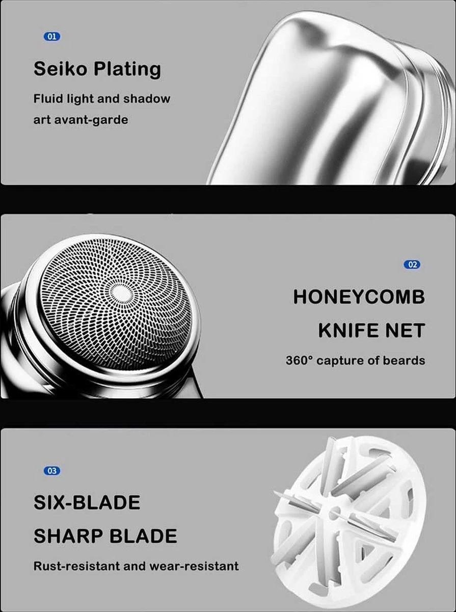 15 messcherp roestvrijstalen turbo wervelstroomblad, gespecialiseerd in harde baard, 0,1 mm dunne roestvrijstalen folie, dubbele ring 3D-mesnet, verhoogt het scheervolume, zwevend boogoppervlak glad en past op de huid, verwijder het haar van de wortel.