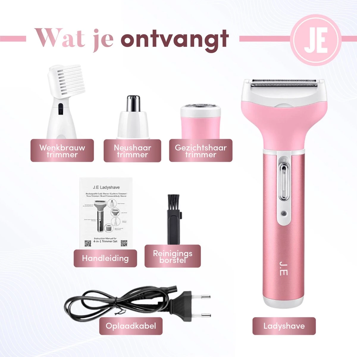 Ben jij ook altijd uren bezig met ontharen? Telkens nieuwe scheermesjes en epilatoren aan het kopen? Allemaal voor die vervelende ongewenste haren. Reken af met deze haartjes en ga voor een verzorgde en stralende look. De J.E. Ladyshave is de perfecte, pijnloze en snelste haarverwijderaar die je gaat vinden. Door middel van vijf verschillende opzetstukken verwijder jij binnen no time jouw ongewenste haren in het gezicht, onder de oksels of bij je bikinilijn.