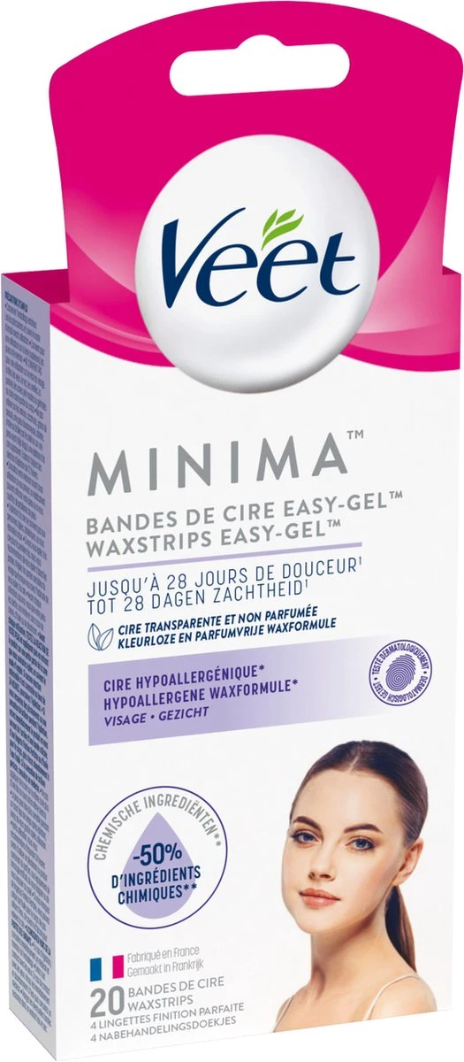 Veet Ontharingsstrips Gezicht Minima voorziet u van een streelzachte en prettig geurende huid. Veet koude ontharingsstrips verwijdert haartjes effectief en heeft tot een week lang resultaat. De strips werken direct dicht bij de wortel en verwijdert zo de korte haartjes bij de gevoelige huid. Alleen de noodzakelijke ingrediënten worden gebruikt en door het weglaten van kleurstoffen en parfum is dit product